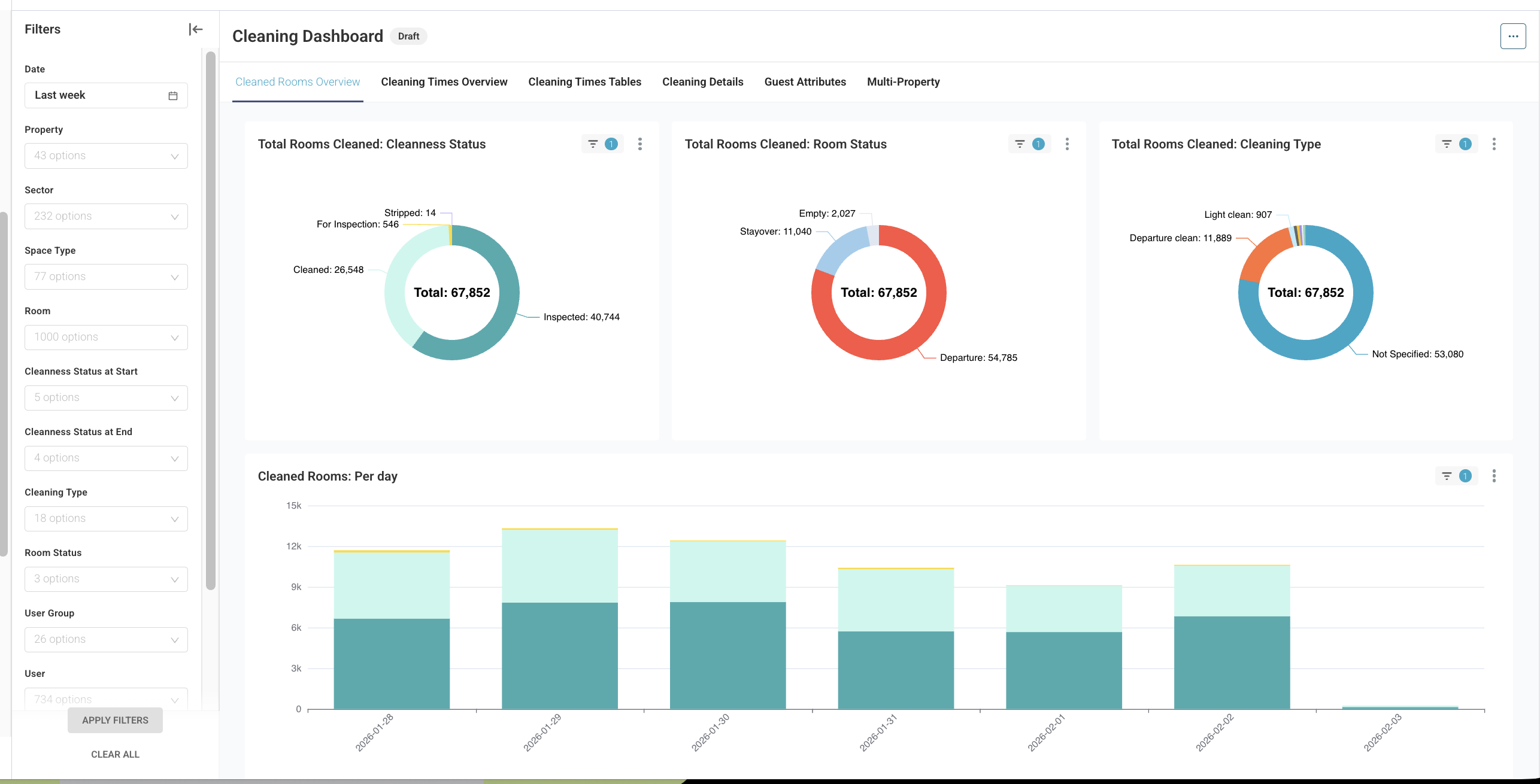 The new Analytics Dashboard gives your hotel a clearer, more detailed view of housekeeping performance. You can analyze larger amounts of data over longer periods of time to help you understand how rooms are cleaned, how long it takes, and where improvements can be made.