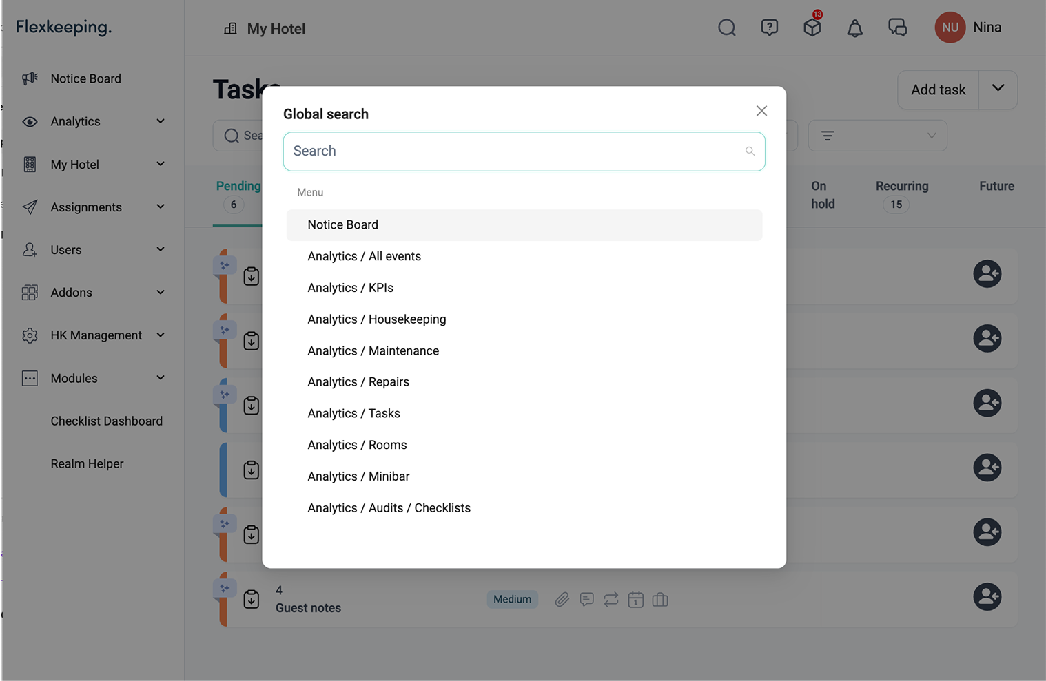 Intenta usar otra palabra clave. Por ejemplo, si buscas “make new profile”, intenta “add user”. Si la Búsqueda Global aún no reconoce tu solicitud, contacta a nuestro equipo de soporte en support@flexkeeping.com.
