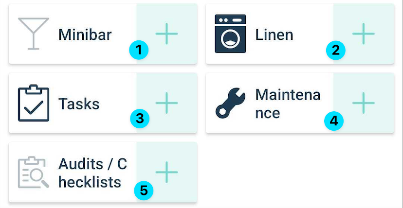 L’utilisateur peut accéder facilement à différents modules depuis la vue d’ensemble de la chambre. La couleur des icônes indique si des actions sont en attente ou complétées :